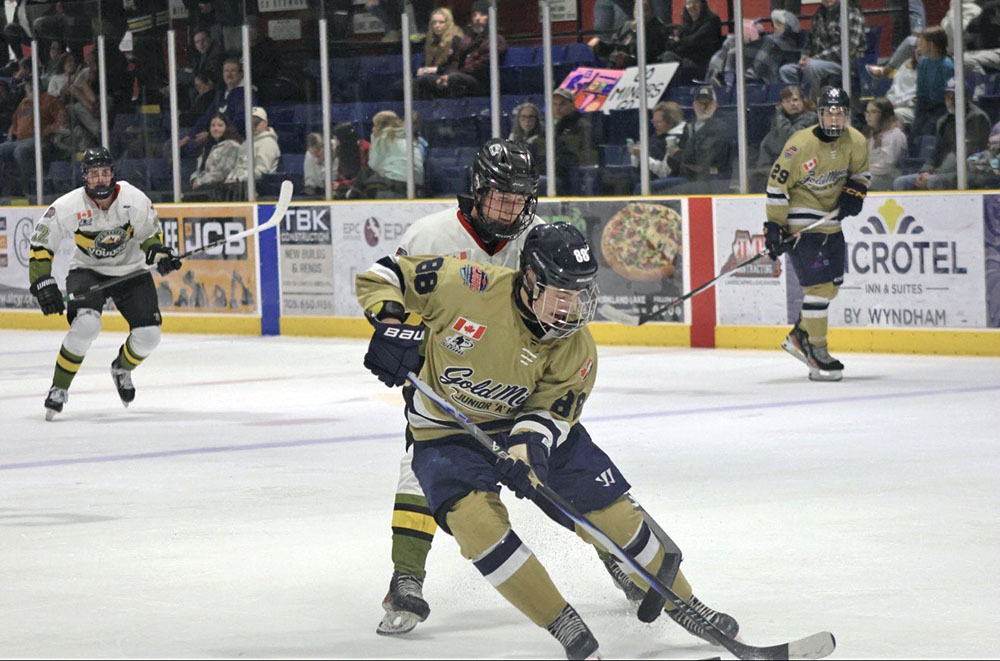 It was the visiting Voodoos who opened the scoring on the night’s initial power play when defenceman Braeden Begley fired a shot from the right point that clipped off a Gold Miners’ defender and got past netminder Glen McIness, 5:13 into the match-up.