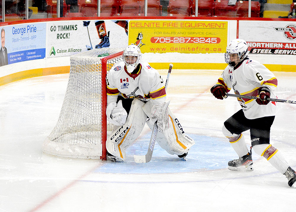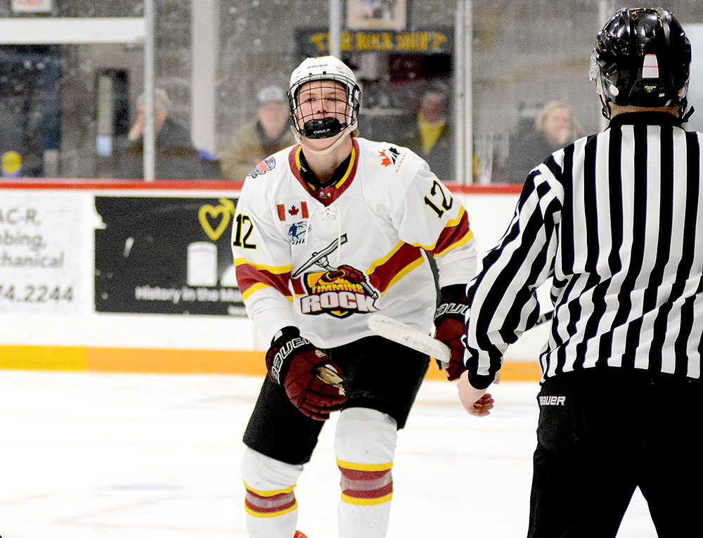 TIMMINS, Ont. – Turning aside every attempt fired his way, Timmins Rock netminder Ayden Mullen posted his second shutout of the season as part of a 5-0 triumph over the Powassan Voodoos in a Northern Ontario Junior Hockey League meeting Friday at McIntyre Arena.
