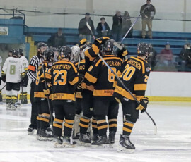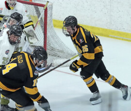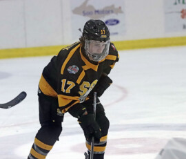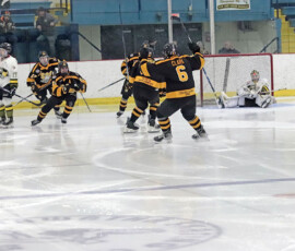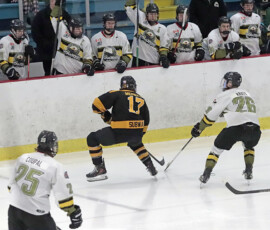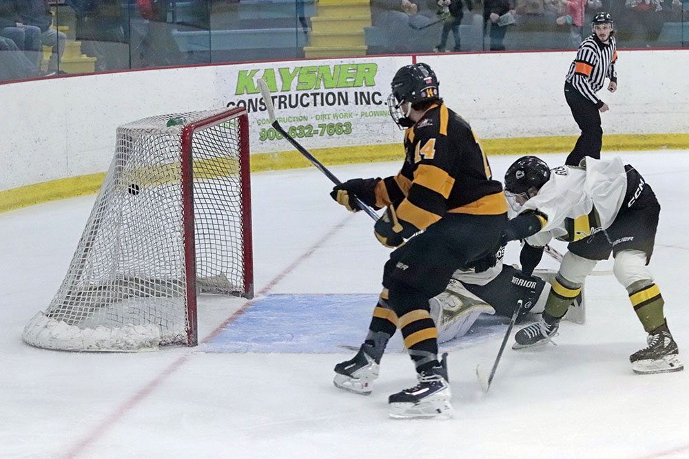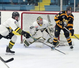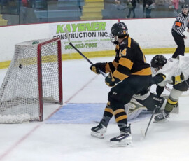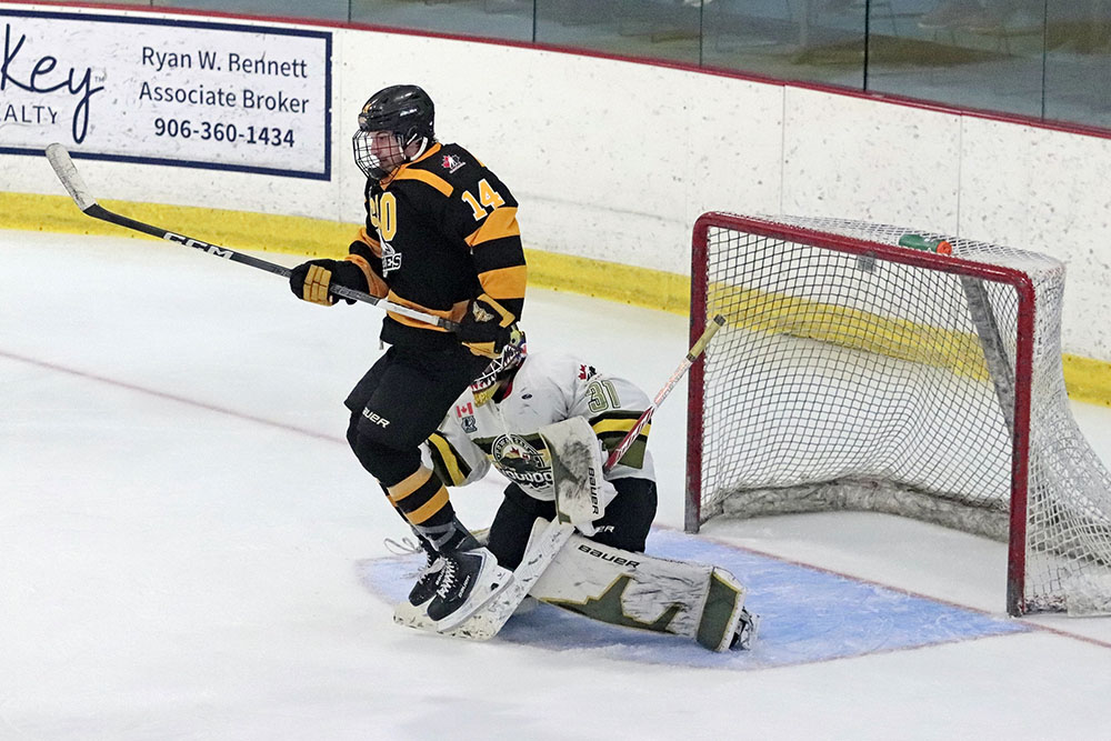 Countering with an equalizer at 14:53, Powassan defenceman Bruce Grey moved in from the point and fired a feed across that Jax Pereira hammered in with a one-timer that flew past Soo starter Jace Knoerle.