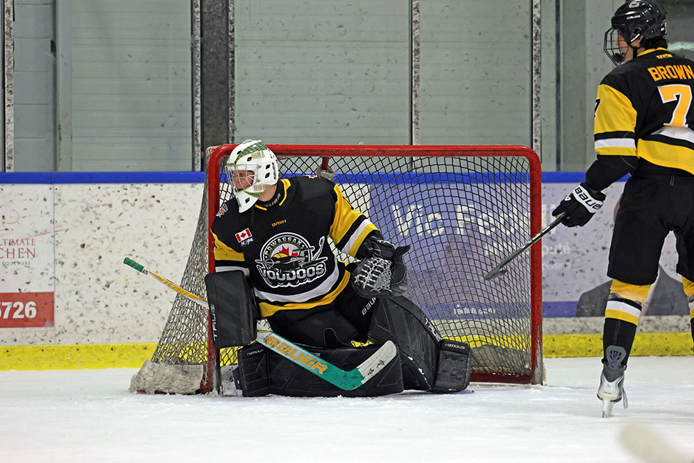 The T-Birds got one back at the tail-end of a man advantage opportunity of their own when Aiden Atkinson drove hard down the right wing then left a drop pass for James Legler who blasted it past Voodoos’ goalkeeper Cole Vreugdenhil at 8:24.